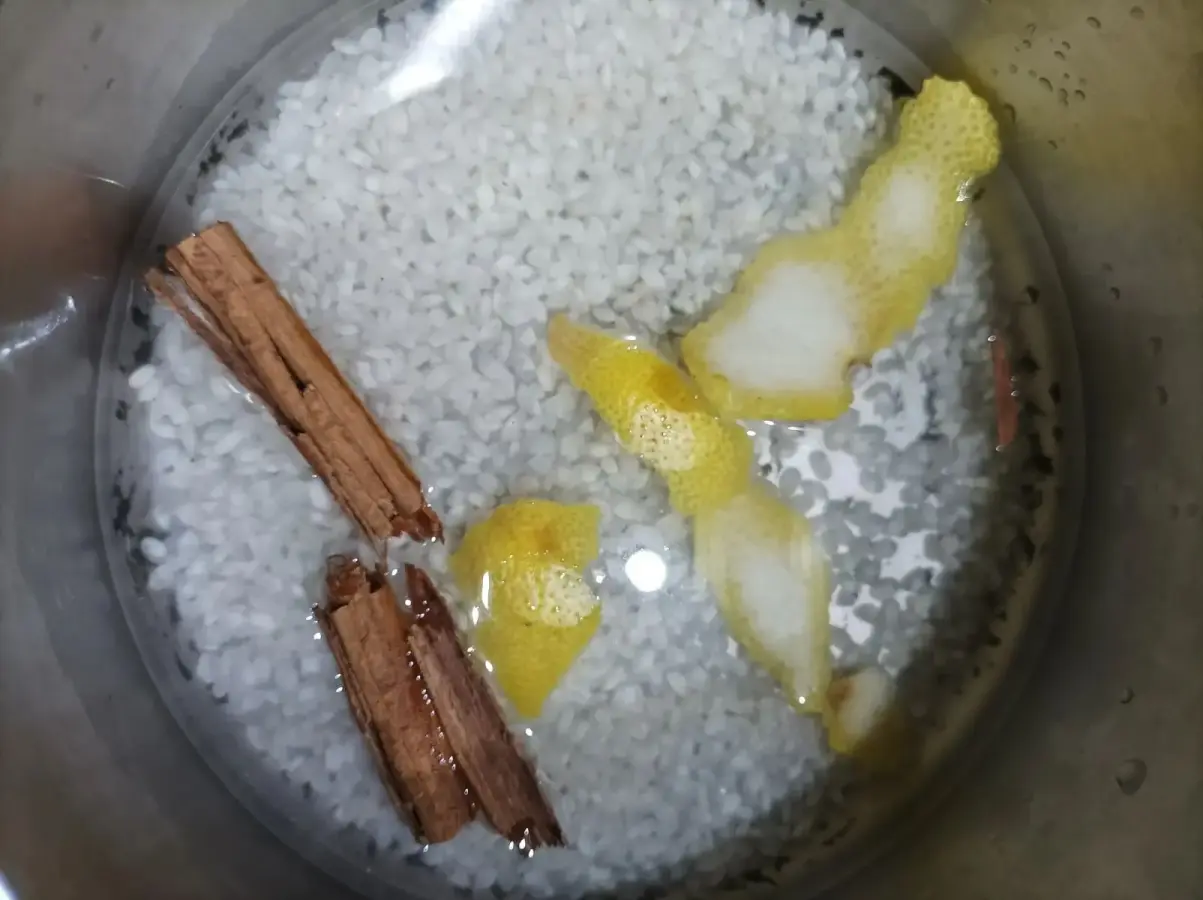 Se pone el arroz con agua, canela y la cáscara de limón. Cuando embebe el agua se le va añadiendo leche hasta que esté tierno y se le agrega azúcar al final.