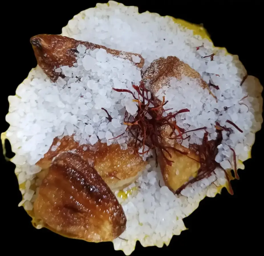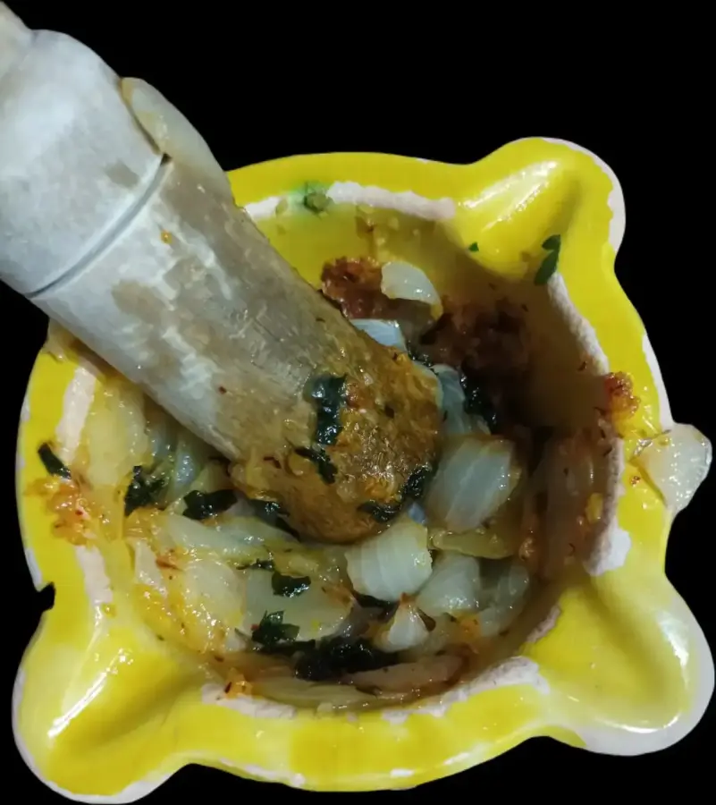 Se prepara en un mortero la sal y el azafrán, se echa el refrito y se maja.