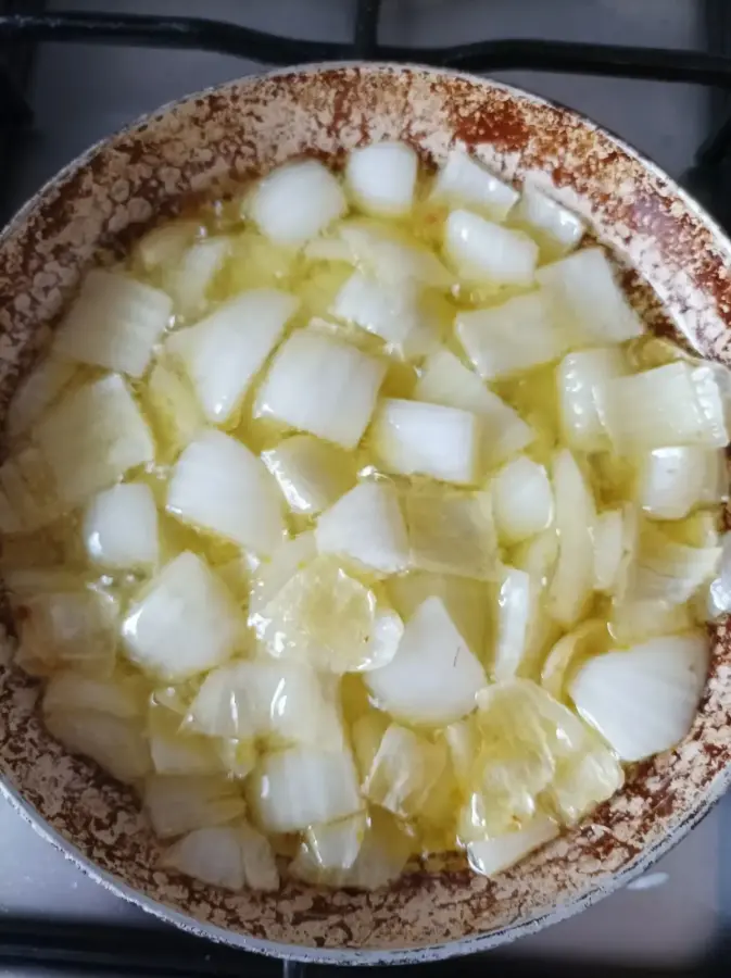 La cebolla se parte en cuadrados y yo la frío hasta que quede pochada, casi transparente.