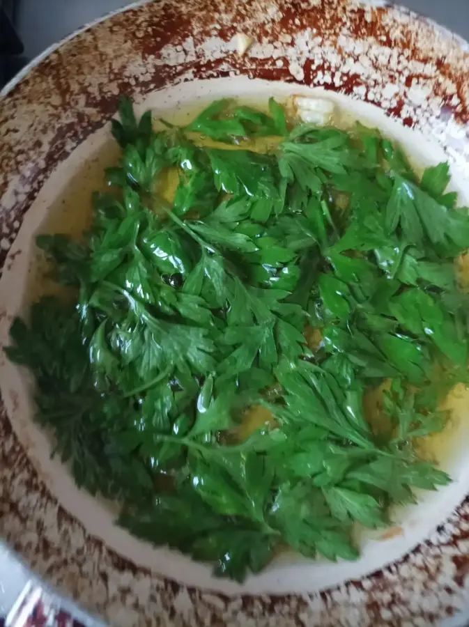 Cuidado al echar el perejil en el aceite caliente. Chisporrotea.