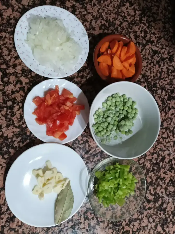 Hacemos el sofrito con la cebolla y el ajo hasta que esté la primera casi transparente. Después incorporamos el pimiento y las zanahorias y al rato el tomate hasta que este impregne de su color la salsa ue se está formando. Salpimentamos.