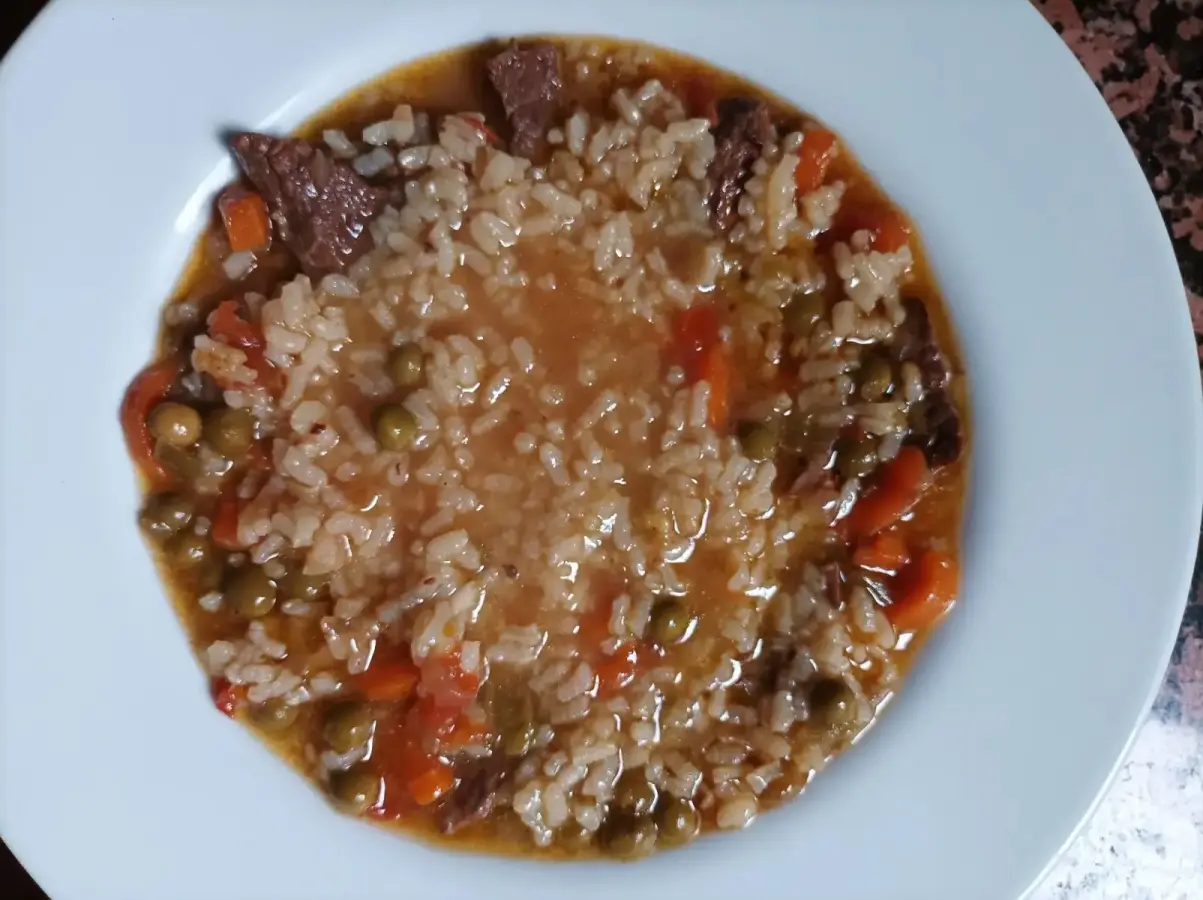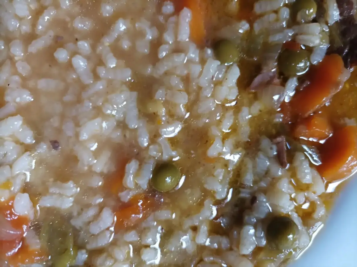 Sobre este preparado echaremos el arroz. Diez minutos de cocción a fuego fuerte, diez a fuego bajo y diez de reposo. Cuidemos de que el resultado final quede caldoso para lo que podemos añadir agua hirviendo en la cantidad precisa.
