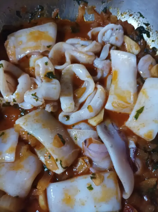 Se refrien los ajos, la cebolla y el perejil. Cuando ya está se le añade el pimiento morrón y un poco de vino. Se le agregan los calamares y el agua y se pone en la olla exprés hasta que estén tiernos, unos 20 o 30 minutos.