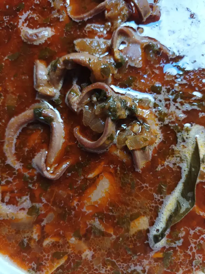 Se refrie todo muy picadito. Se echan los calamares con un poco de vino y agua hasta que esén tiernos y quede en salsa