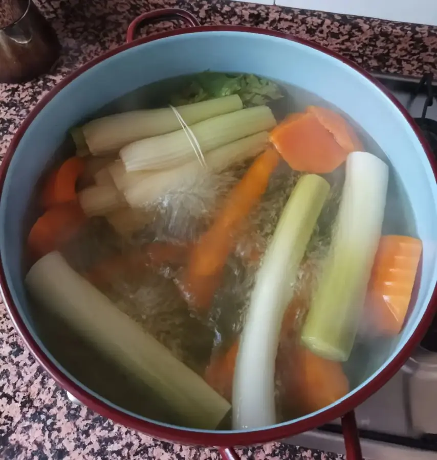Cociendo las verduras. El apio lo ato con un cordón para que no se deshaga. Esta vez le puse calabaza naranja, por no tener a mano la amarilla, y dos puerros