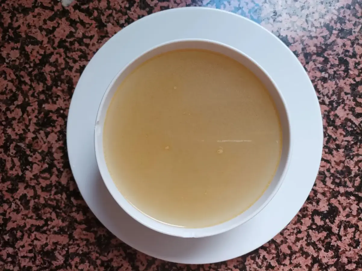 Aquí se puede apreciar que el caldo (colado, mezclado con el de verduras y reposado) es pura gelatina