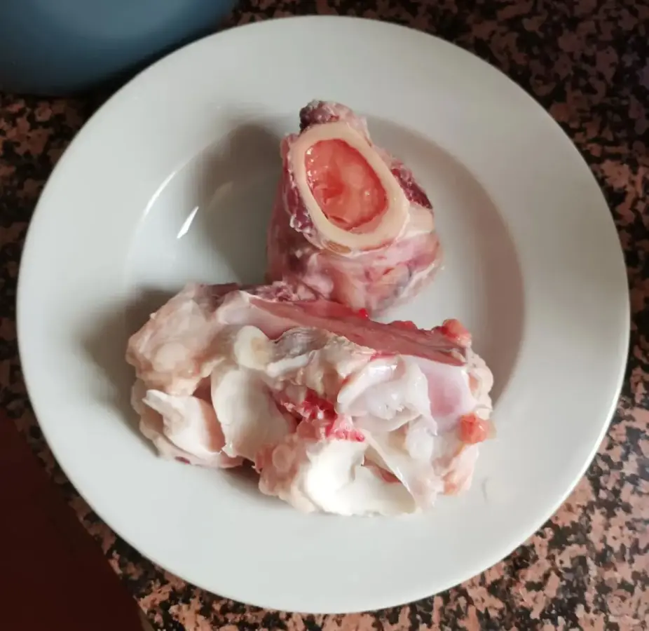 Dos trozos de hueso de ternera. En uno de ellos se aprecia con claridad el tuétano