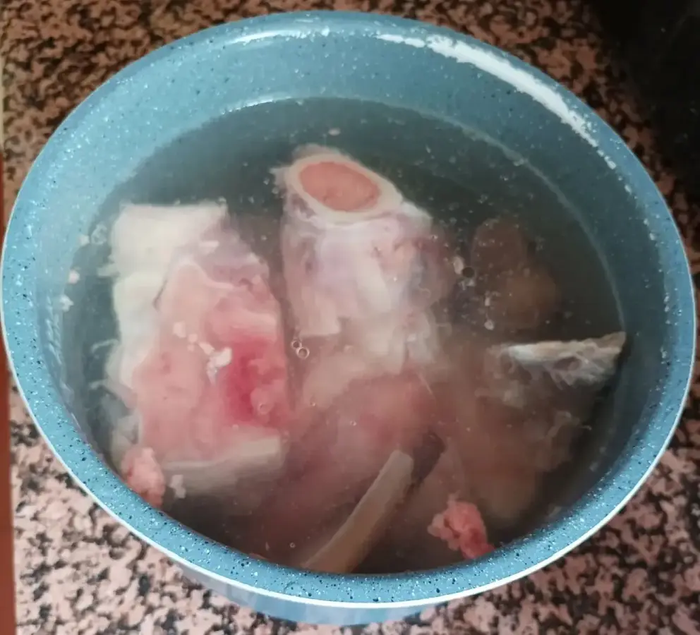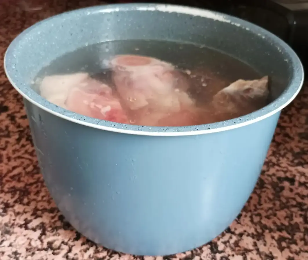 Se ponen los huesos con agua hasta el límite que permite la olla y la tacita de vinagre de manzana en el recipiente que irá dentro de la olla GM durante 2 horas