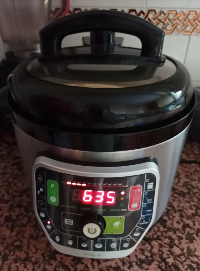 Se añade la cebolla morada partida por la mitad, se introduce en la olla, se cierra, se enchufa, seleccionamos la función «COCCIÓN LENTA» (90ºC) y programamos el máximo de tiempo que renovaremos hasta alcanzar las 24 horas