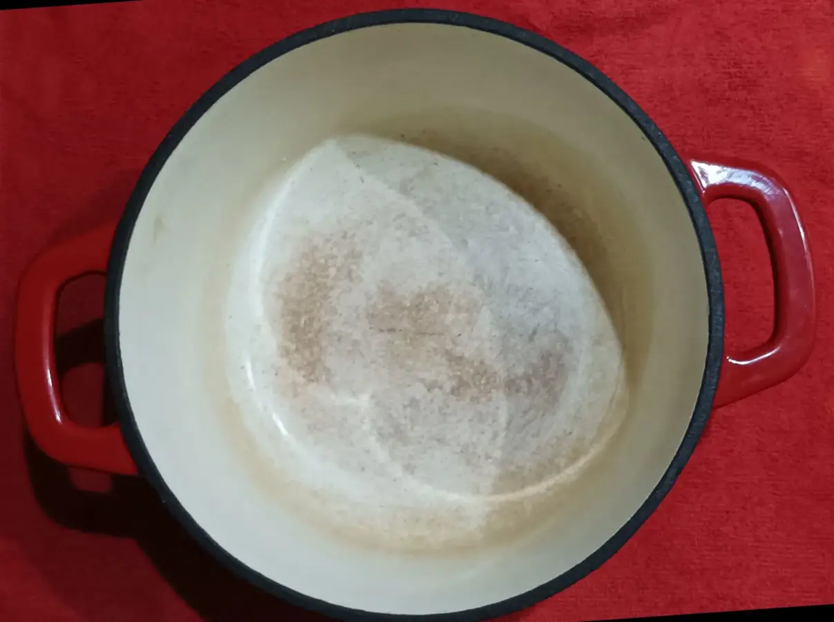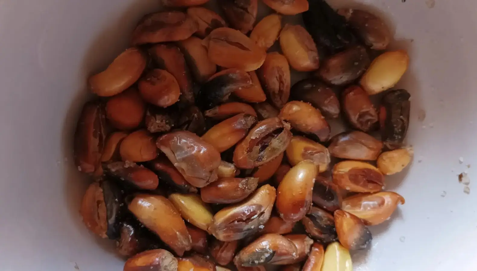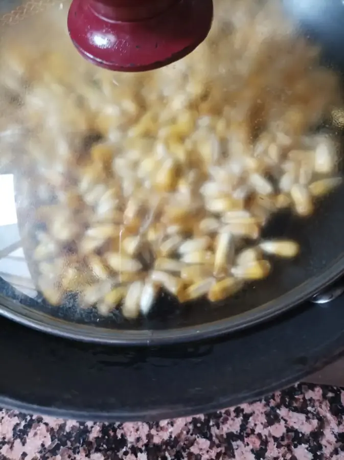 Bajamos el fuego y seguimos removiendo hasta alcanzar los veinte minutos y que el maiz coja un color tostado. Mientras que se remueve el maíz, se debe utilizar la tapadera como escudo de nuestro cuerpo. Esto es muy importante pues las salpicaduras de aceite o los granos que al explotar saltan del recipiente nos pueden quemar.