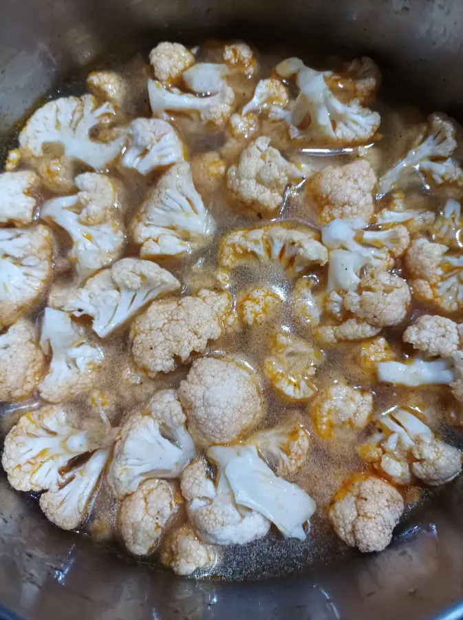 Una vez sofrito el pimentón con sus gotitas de vinagre para que no se queme, mareamos la coliflor, añadimos agua y el majado y a hervir