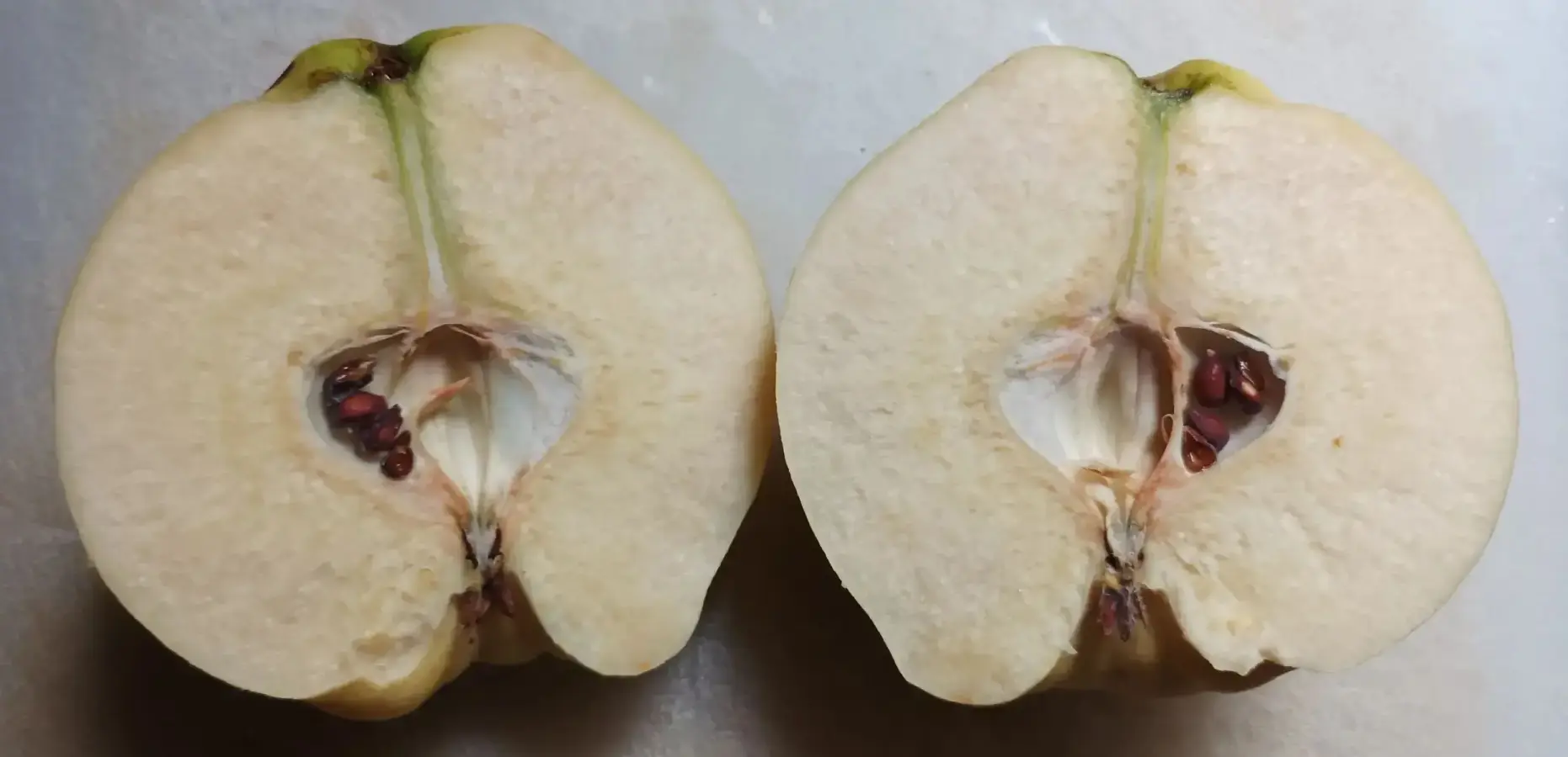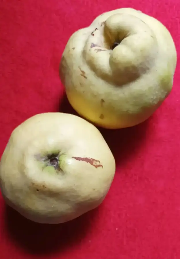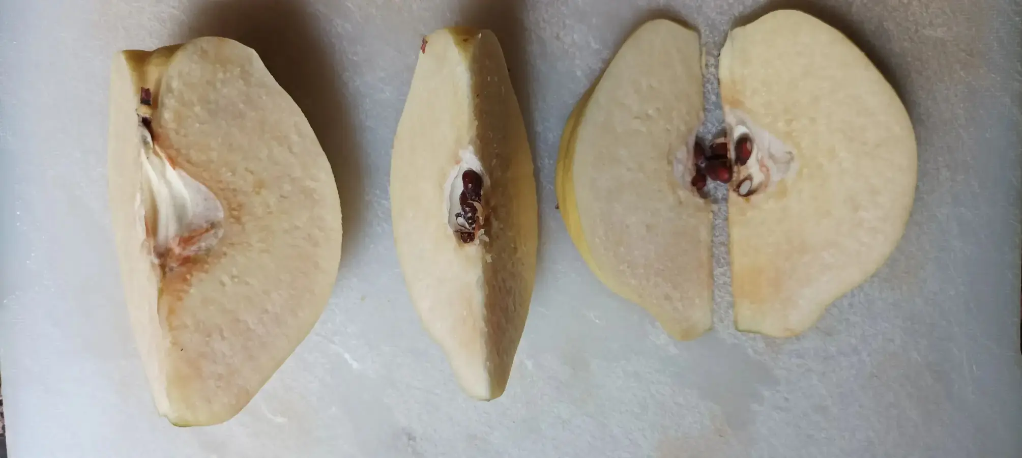 La parte más fastidiosa es la inicial: partir y pelar los frutos. Ante todo recomiendo lavar bien los membrillos con agua y unas gotitas de lejía. Después, con un cuchillo grande y bien afilado, cortamos longitudinalmente cada uno en ocho trozos teniendo en cuenta que la parte central, donde se alojan las semillas, es semileñosa; o sea, bastante dura. Para ello hacemos los cortes sin que lleguen al final de la pieza y cuando ya están realizados los cuatro necesarios terminamos de cortar el final de las partes. Procederemos a quitar la piel con un cuchillo pequeño a cada trozo, fácilmente como si de una manzana se tratase. Con este mismo cuchillo sacamos la parte del núcleo haciendo una curva. Yo reservo la piel y la zona de semillas para meterlo todo en una red o cocerlos en una cacerola aparte. Los pedazos de pulpa limpia los vamos depositando en un una fuente grande con agua y el zumo de medio limón, para que no se oxiden mientras seguimos haciendo la misma tarea con el resto de los membrillos.