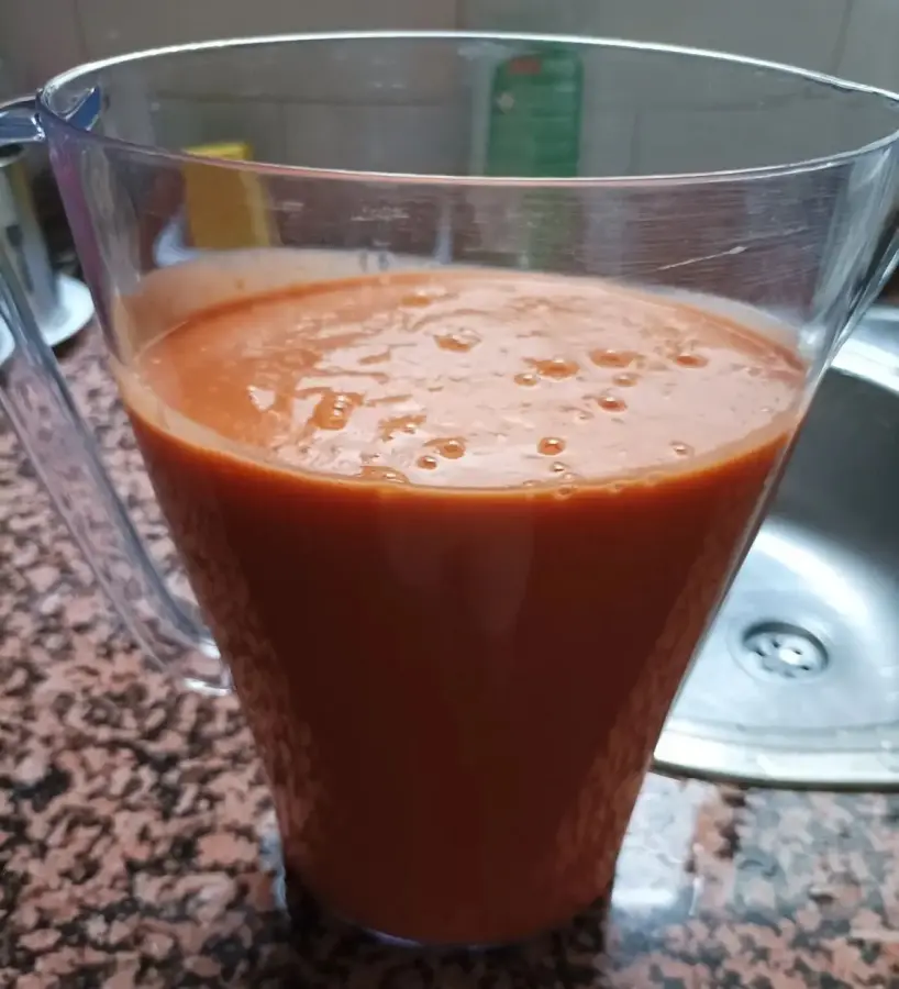 Como el resultado de la preparación descrita quedará muy espeso, al servirlo yo añado medio vaso o bol de gazpacho y medio de agua bien fría. A quienes les guste tomarlo como sopa en plato o bol y deseen añadirle tropezones, ya saben que pueden hacer uso de cebolla, huevo duro, pepino, pan, picos, etc. todo bien picado. Yo lo suelo tomar en vaso como aperitivo o como acompañamiento al plato principal (siempre que este no lleve tomate como ingrediente básico)