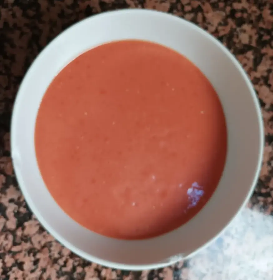 El gazpacho en el recipiente que ha de ir en el frigorífico