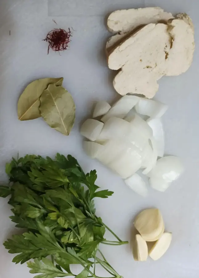 Se frie una rebanada de pan, se pone en el mortero con sal y azafrán y se maja todo. Se refrien los ajos, la cebolla y el perejil y se maja con todo lo anterior. Se vuelca en la cacerola con agua y se añaden los guisantes. Se deja hervir durante 5 o 10 minutos.