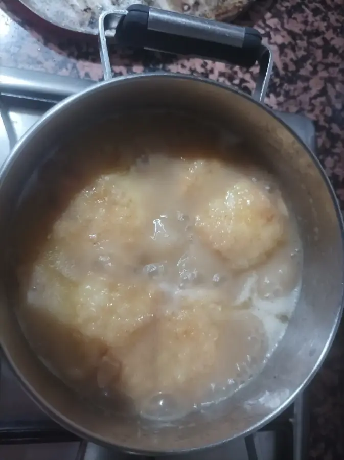 Se añaden las gotas de vinagre, la hoja de laurel y agua hirviendo para que se haga un poco el caldo durante 10 minutos. Después el pescado frito, cuidando de que el agua lo cubra todo y se deja cocer 15-20 minutos para que se reduzca la salsa