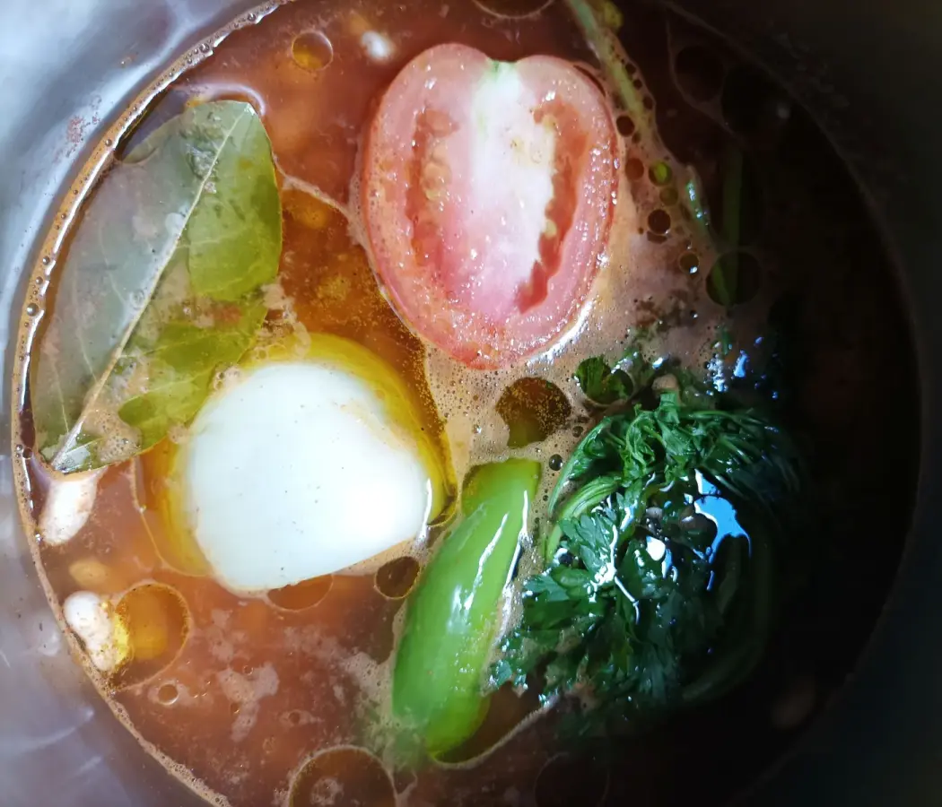 Se echan todos los ingredientes con el agua fría. Se pone al fuego. Cuece hasta que esté tierno.