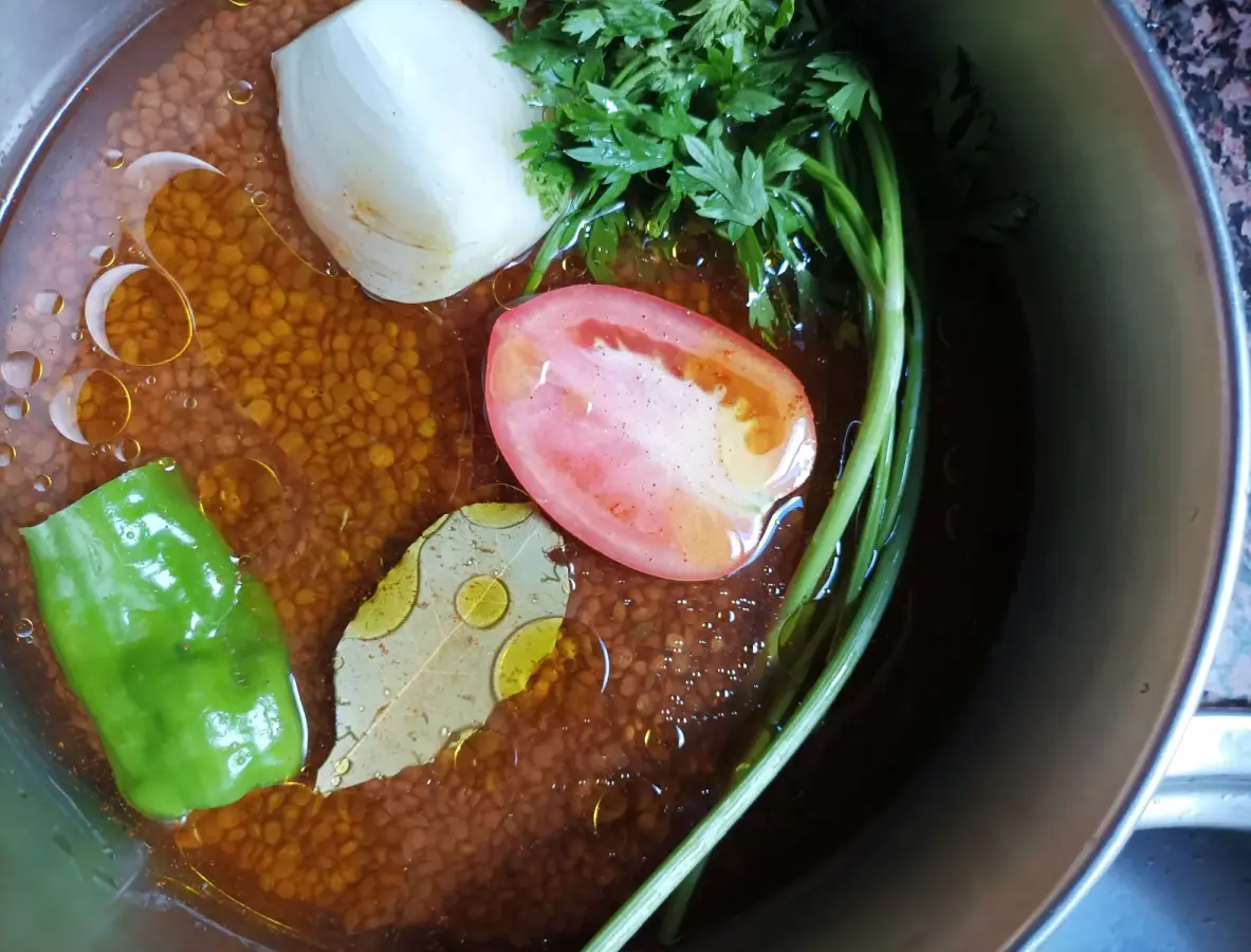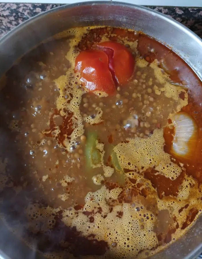 Se echan todos los ingredientes con el agua fría. Se pone al fuego. Cuece hasta que esté tierno.