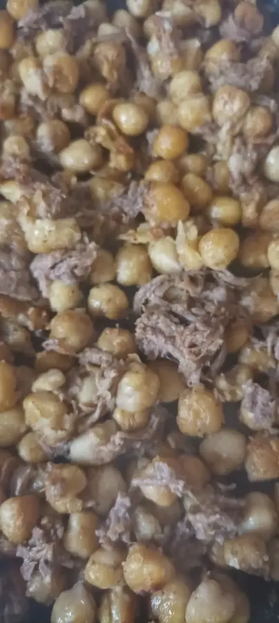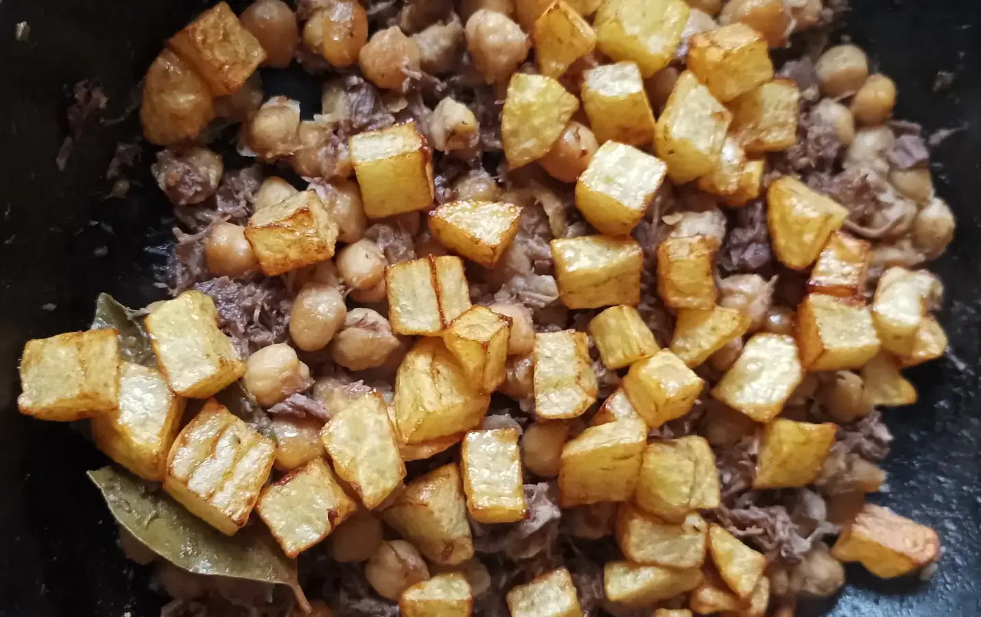 En una sartén echamos un fondo generoso de AOVE, ponemos los garbanzos, los ajos, la hoja de laurel y la sal… y a darle vueltas y vueltas y vueltas…, durante 10 o 15 minutos, hasta que los garbanzos queden fritos de un color dorado y hermoso, evitando que se achicharren. En los últimos minutos habremos añadido la carne para que también se maree con algunas vueltas.