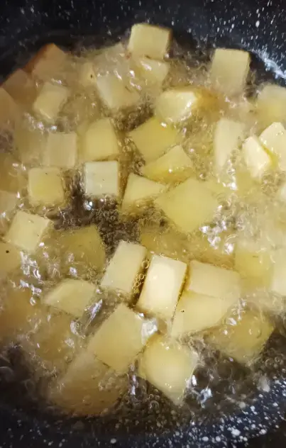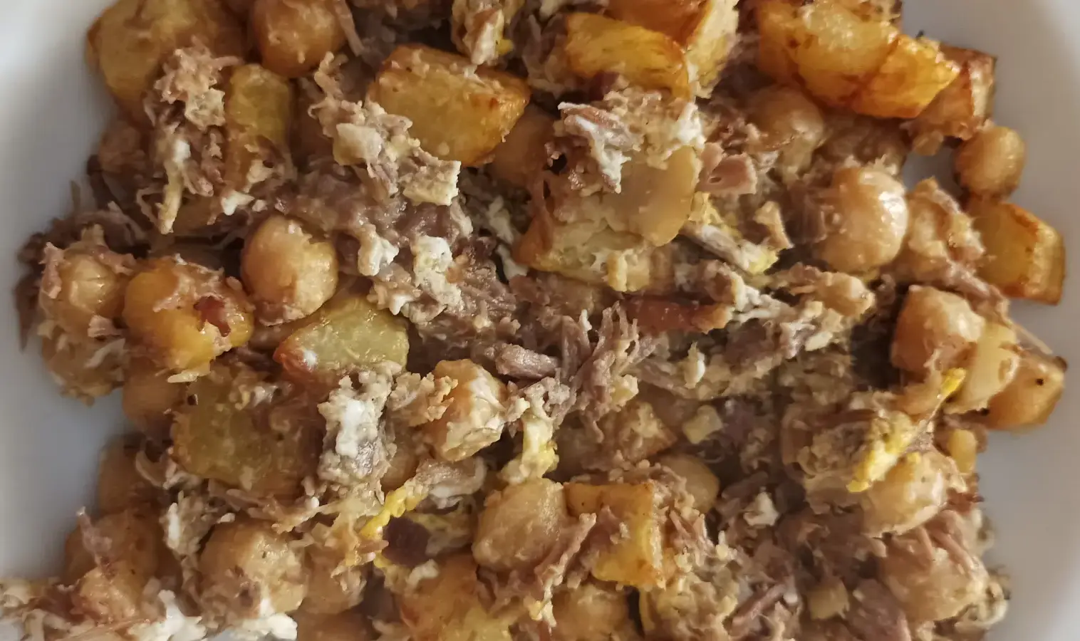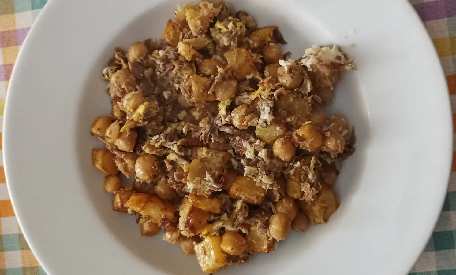 Mi madre completaba este plato con unas papas, cortadas en pequeños dados, fritas y unos huevos estrellados y revueltos con todos los ingredientes en la sartén (si la memoria no me falla)