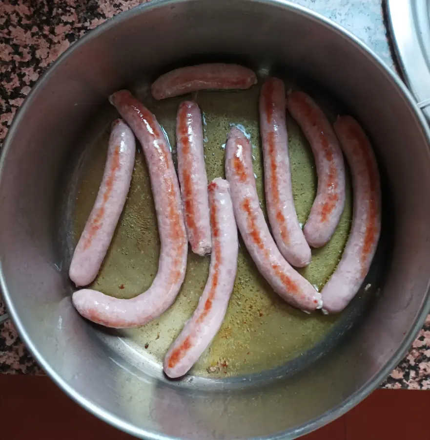 Se pone AOVE en una cacerola grande y se van friendo un poco todas las salchichas. Como 3 minutos por cada lado. Se aparrtan en un recipiente.