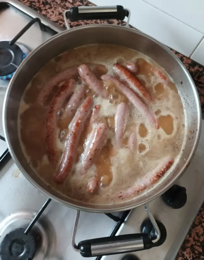 Para esta alternativa no hace falta esperar a que las cebollas se caramelicen; bastará con pocharlas. Se vierte sobre la cacerola las salchichas reservadas, se añade el vaso de manzanilla y se deja que se evapore el alcohol por 15 minutos. Se vierte agua hirviendo que cubra todo y se deja cocer por media hora. Estarán más ricas si en vez de agua se le echa caldo del puchero o en su defecto una pastilla de concentrado de carne disuelta en agua. Si se quiere con menos caldo o se deja cocer más tiempo o se saca la carne y se deja reducir el líquido. Se sirve el guiso encebollado.