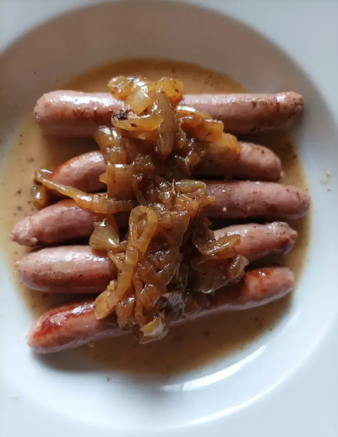 Apartamos la cebolla caramelizada. Sobre el jugo se echan las salchichas y se procede como en la Alternativa 1. La diferencia está en que a la hora de servir se disponen las salchichas con algo de caldo en el plato y se coronan con la cebolla caramelizada tal como aparece.en la foto 8.