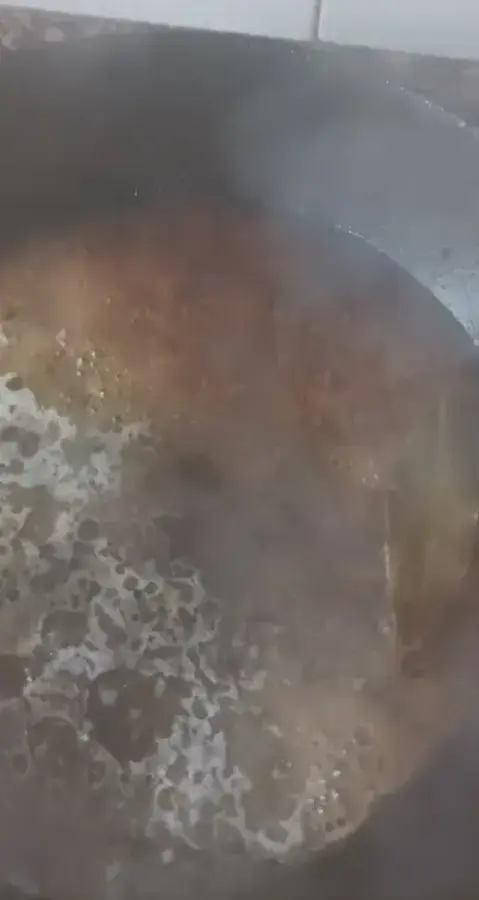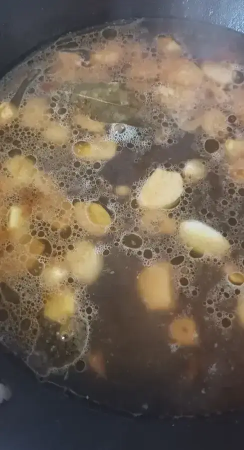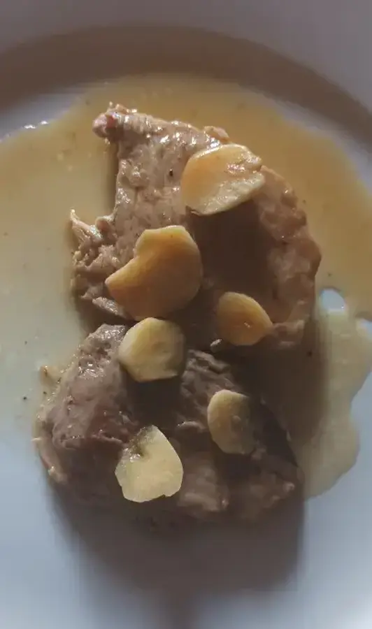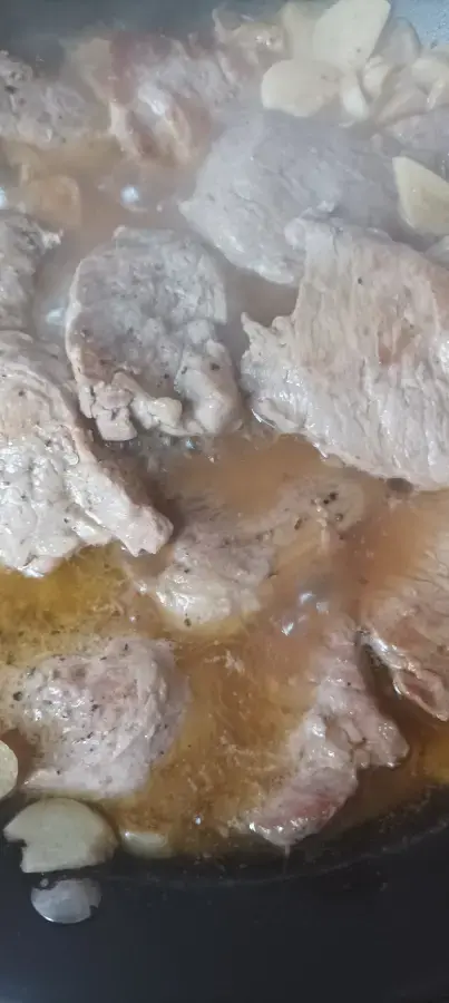 Sobre la costra formada añadir algo más de AOVE, el zumo de limón, la manzanilla y el whiski y verán como se despegan los restos quemados de la carne y la salsa va tomando un color delicioso. Añadir los ajos.