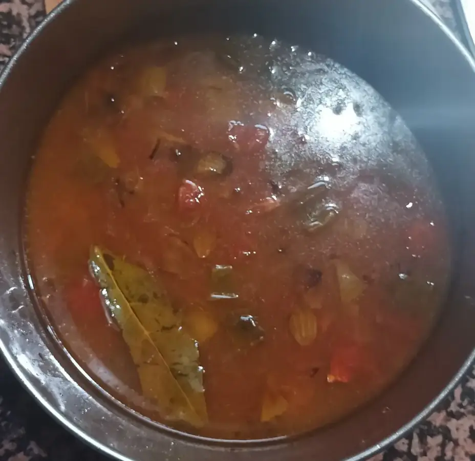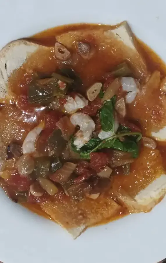 Se cuecen las gambas. Se pone en una cazuela, tomate, pimiento y cebolla con un poco de aceite, luego se le añade el caldo de las gambas. Cuando ha cocido un poco se aparta y se le echa el pan cortado a tiras.