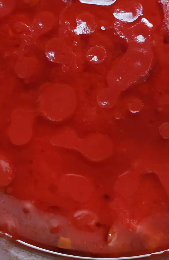 Pongo una generosa porción de AOVE con la hoja de laurel y, cuando esté templado templado, añado la cebolla, el ajo, el pimiento y la zanahoria. Después de pochar las verduras y cuando todo esté blandito añado una lata de 700-800 grs. de tomate triturado. Espero a que el aceite suba a la superficie con color atomatado. Aparto la cacerola y dejo que se temple un poco. Quito la hoja de laurel, lo trituro todo con la batidora de varilla, reincorporo el laurel, añado la sal, la pimienta y las hierbas (mejor si son frescas) y vuelvo a ponerlo en el fuego con llama media y a esperar de nuevo que vuelva el aceite a la superficie. Probar y si está ácido, añadir una cucharadita de azúcar. ¡Ah! Y después de incorporar el tomate, tanto en la primera fase como después de aplicar la batidora, la cacerola siempre tapada para que no salpique. Si no, la encimera y la pared de la cocina quedará hecha un Ecce Homo…
