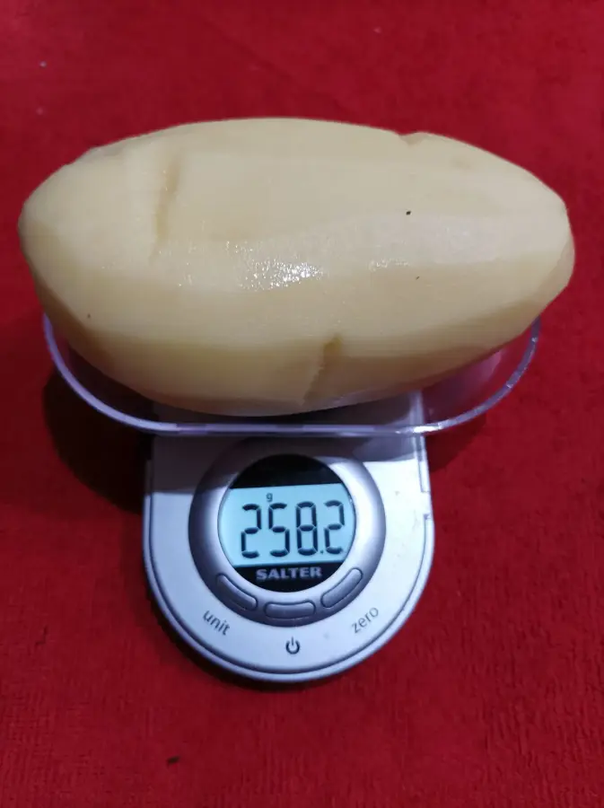 Se cuecen las patatas y se machacan. Se separan las yemas de las claras. Se baten las tres yemas y se las añade a las patatas, junto con la mitad del coco y la mitad del azúcar. Se amasa todo bien y a continuación se hacen bolas, se envuelven en azúcar y se ponen en un molde de papel. Se aprovechan las claras haciendo la misma operación.