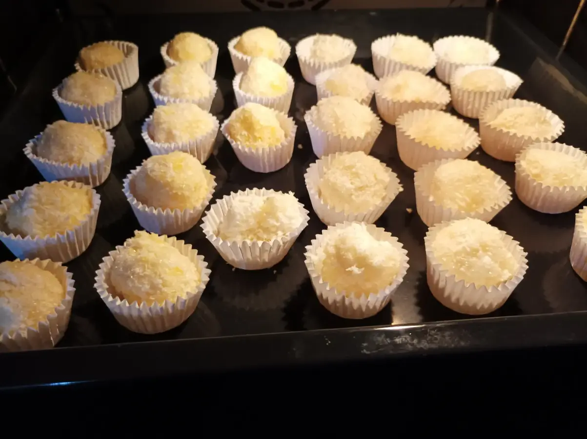 Amasamos con las manos (a ser posible limpias), hacemos bolitas, las pasamos por azúcar y las colocamos en unos moldes pequeños de magdalenas o pilotines sobre una bandeja de horno